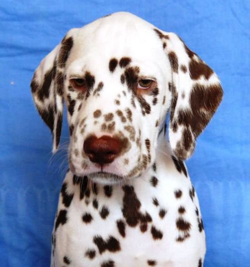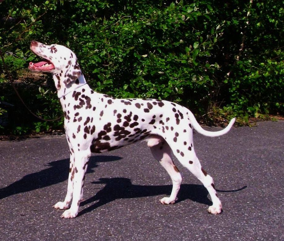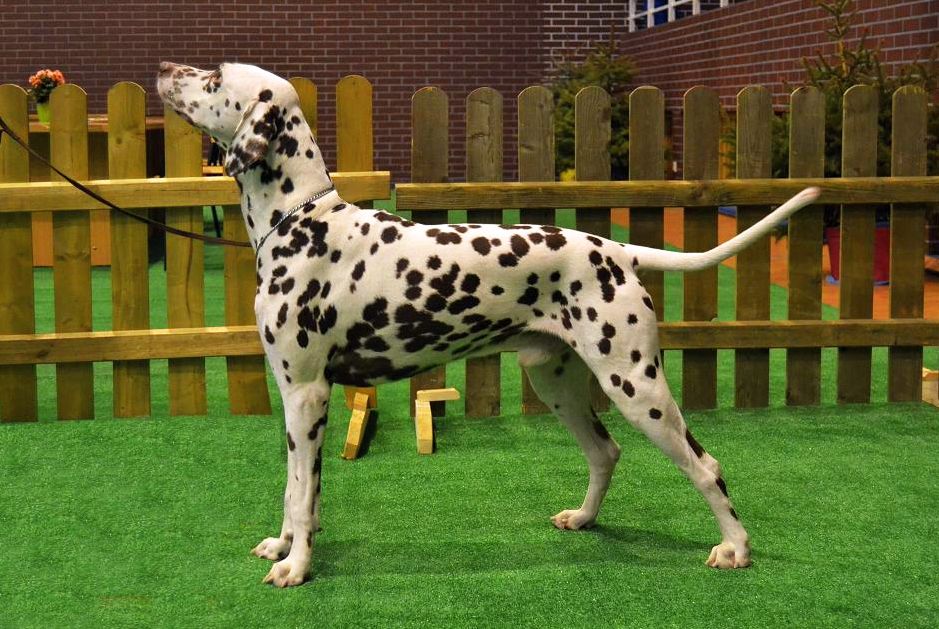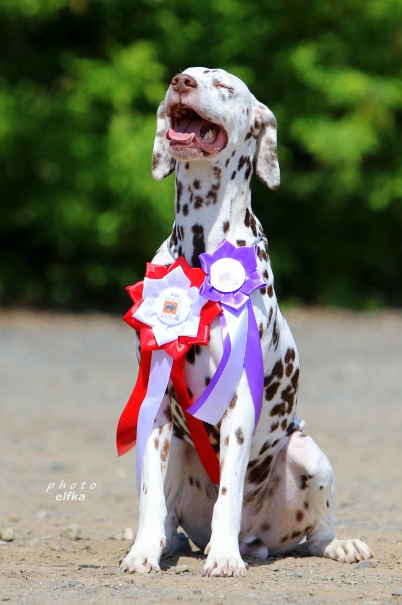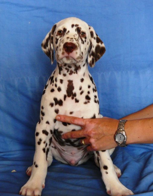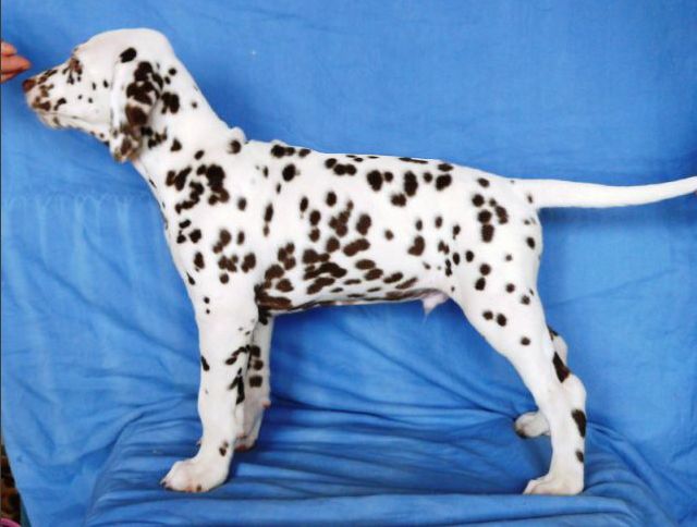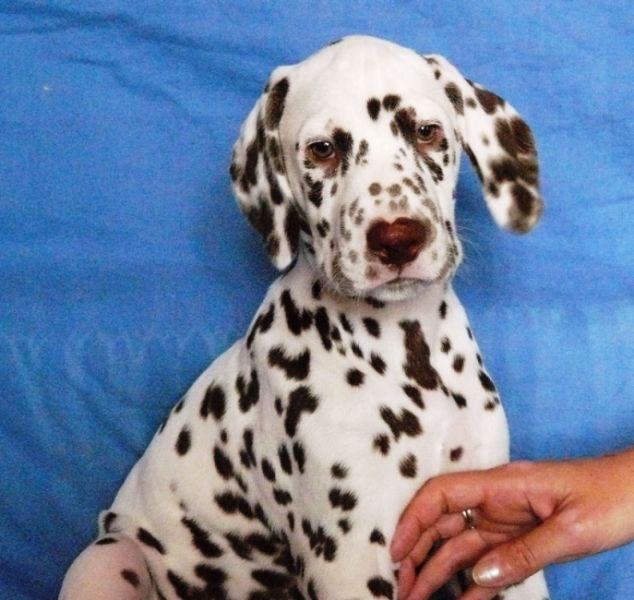 ...celkově ušlechtilý pes s velkou elegancí, tmavé oko, s výraznou hlavou, správný postoj a správné uhlení předních i zadních končetin - kvalitní srst, správné tečkování, výrazný pigment, laková játrová hnědá v kombinaci se sněhově bílou, velké tečky , s kohoutkovou výškou v poměru 10:9 (přesně dle standardu plemene), s dobře osvalenou postavou, elegantní aktivní pohyb, výborná linie, pevný rovný hřbet, výborně nasazený ocas správně nesený v postoji i v pohybu. Vyrovnaný, temperamentní pes s aktivní přátelskou povahou."