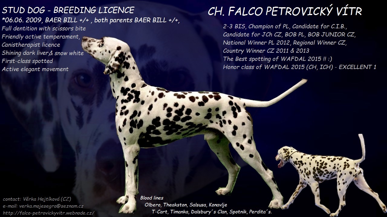 Ch. Olbero Olympic Playa "Charles", bráška Falcouškovi babičky Ch. Olbero Olympic Dreamgirl "Sindy" - BAER bilat. +/+, All teeth, Ch. CZ, Special show W., CACIB 2x, r.CACIB 3x, VDH CAC, byl opravdu krásný kluk, kterému příroda krásu hodila do vínku přímo lopatou. Je krásně vidět genetické předávání krásných a zdravých genů z dědečka Ch. Salsusa Astar Playa "Thomas" na tatínka Ch. Doctor Fox By Salsusa - Ch UK, 3x BOB Cruft´s na syna Ch. Olbero Olympic Playa "Charles" až na našeho Falcouška, jak můžete vidět v rodokmenu. Charles byl pro mě skutečný Princ dalmatinů :)