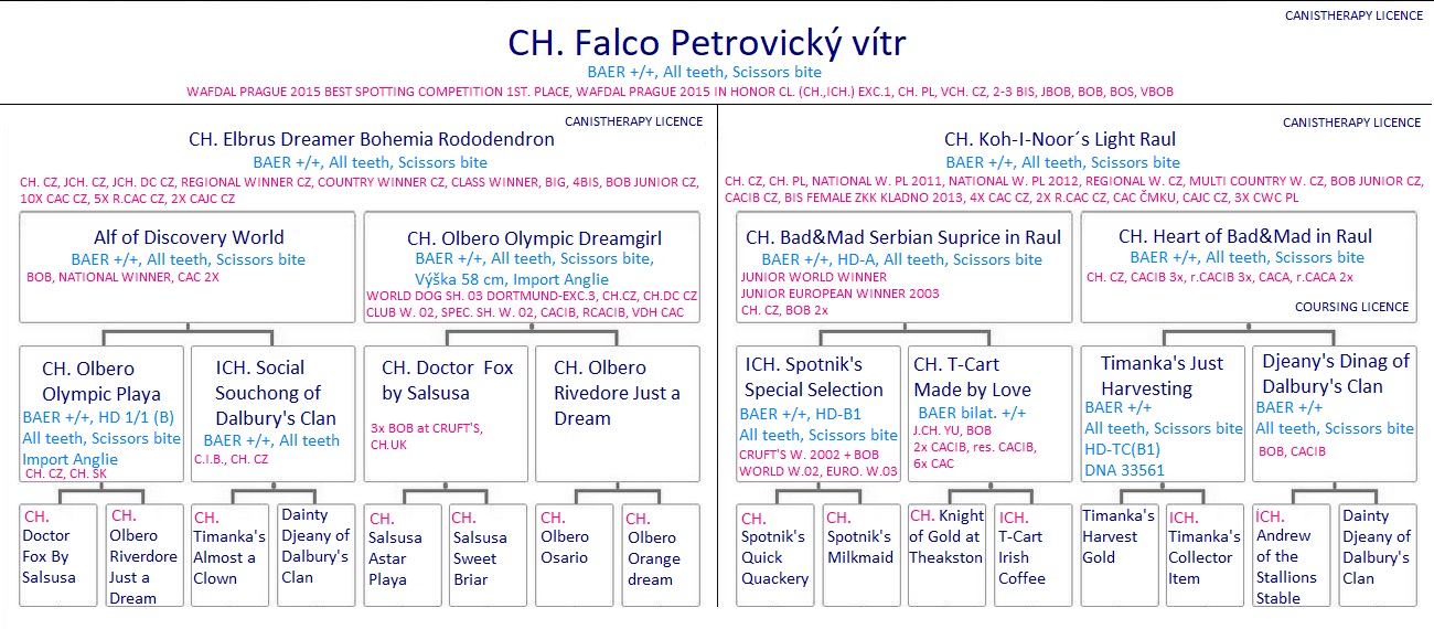 Také díky tomuto nádhernému předkovi, Championovi, je Falcouškův rodokmen velice kvalitní, jak po exteriérové tak po zdravotní stránce..